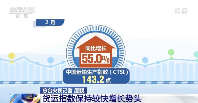 2月份,中國運輸生產指數(CTSI)為143.2點,同比增長55.0%。分結構看,CTSI貨運指數為179.3點,同比增長41.7%;CTSI客運指數為67.2點,同比增長151.1%,但較2019年2月仍下降59.3%。