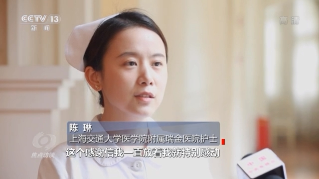 上海交通大學(xué)醫(yī)學(xué)院附屬瑞金醫(yī)院護(hù)士 陳琳:感謝信上面最后他寫道,他說這個世上沒有救世主,是你們在人間創(chuàng)造奇跡。這個感謝信里面其實也描繪了平常我們工作中對他的點點滴滴的護(hù)理,我們對他的鼓勵,包括我們對他的寬慰,平常對他的治療。這個感謝信我一直放著,我就特別感動。