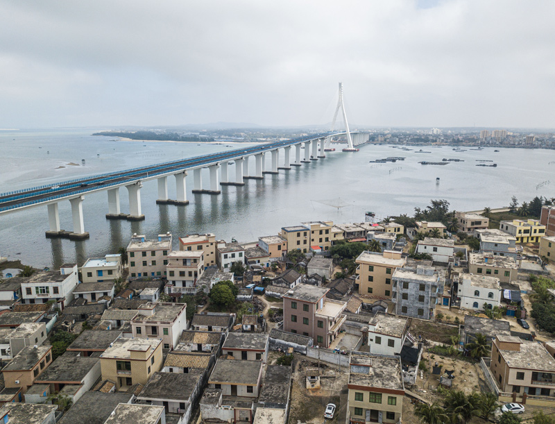 2月6日拍攝的海南海文大橋和海口北港島一角(無人機照片)。海南海文大橋北港島互通工程于2月4日建成通車。新華社記者 蒲曉旭 攝