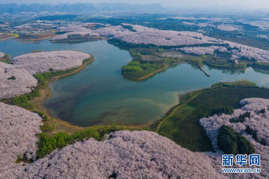 近日,貴州省貴安新區紅楓湖畔的櫻花觀光園內萬畝櫻花競相盛開,吸引不少游客前來觀賞。