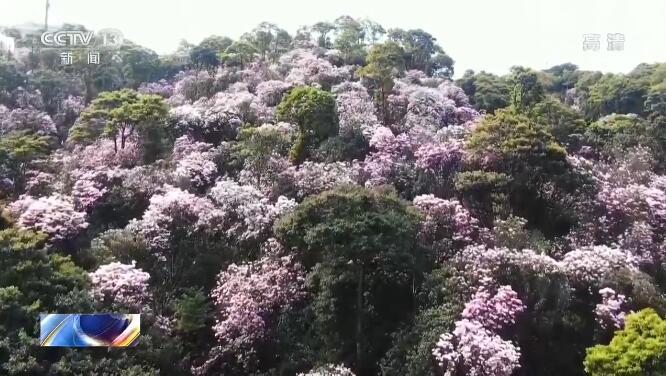 春意盎然的三月,深圳羅湖的梧桐山上的毛棉杜鵑爭相綻放。登高遠眺,漫山闊葉林成片延伸,粉紅色的花團嵌在其間形成花海,春風拂過山林,一樹樹毛棉杜鵑也隨之翻涌成浪。
