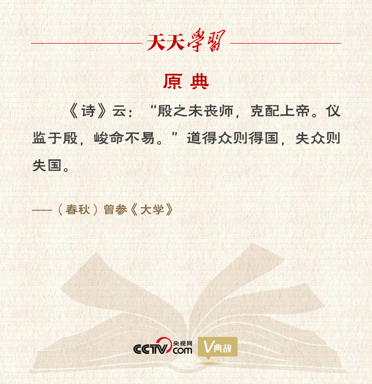 《大學(xué)》多次引用并闡釋《詩經(jīng)》中的詩句。原典中的“殷之未喪師,克配上帝。儀監(jiān)于殷,峻命不易”出自《詩經(jīng)·大雅·文王》。喪師:失去民眾;儀:當(dāng)作“宜”;峻命:大命,即天命。這句話意思是說,商沒有失去民心的時候,還能與天意相稱。我們應(yīng)該以殷商為戒鑒,天命才不會變更。進(jìn)而得出如下結(jié)論:“道得眾則得國,失眾則失國。”道:指治國的道理。意謂得到民眾的擁戴就能得到整個國家,失去民眾的擁護(hù)就會失去整個國家。這句話與孟子的“得道者多助,失道者寡助”一樣,都闡述了民心向背關(guān)乎國家興亡的道理。