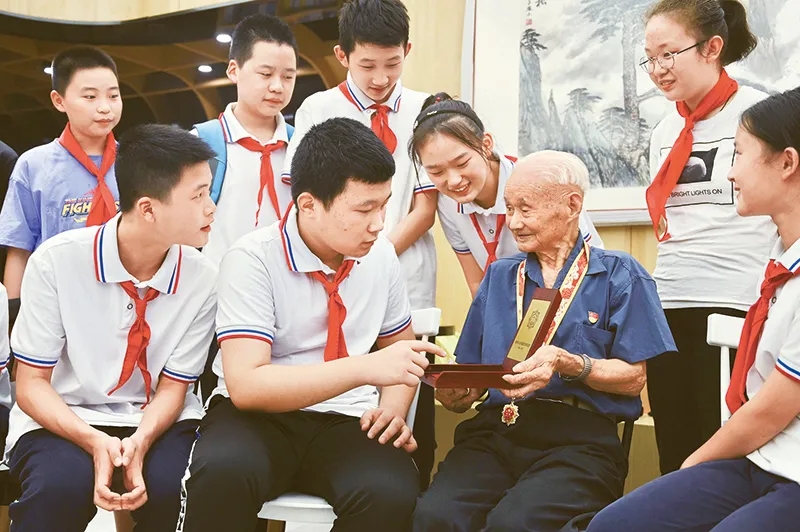 2020年8月23日,安徽省合肥市薛河灣社區(qū)舉行“聽老兵講故事”愛國主義主題教育活動,少先隊員們聆聽老兵講述抗戰(zhàn)故事,銘記戰(zhàn)爭的苦難與勝利的光榮。圖為學(xué)生們在聽九旬老兵施長明講自己當年的戰(zhàn)斗故事。中新社記者 韓蘇原/攝