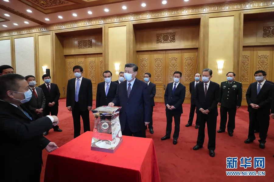 2021年2月22日,黨和國家領導人習近平、李克強、栗戰書、汪洋、王滬寧、趙樂際、韓正等在北京人民大會堂會見探月工程嫦娥五號任務參研參試人員代表并參觀月球樣品和探月工程成果展覽。這是習近平等在人民大會堂東大廳參觀月球樣品和探月工程成果展覽。新華社記者 王曄 攝