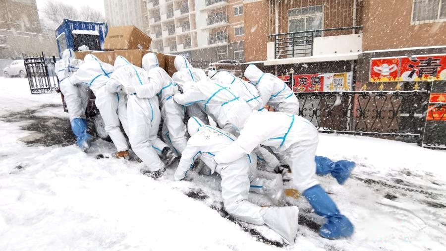 ▲2021年1月6日,大連海洋大學的學生們頂風冒雪推車運送防疫物資。