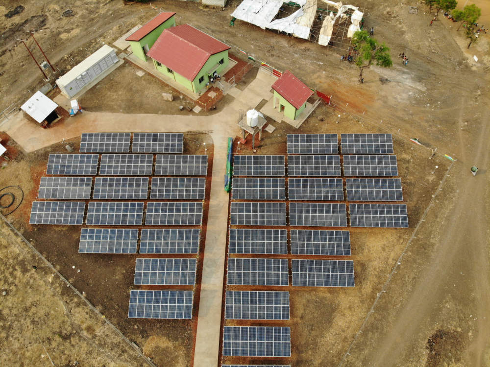 這是3月12日拍攝的中國國家電網中國電力技術裝備有限公司與南京南瑞繼保工程技術有限公司以聯合體承建的埃塞俄比亞甘貝拉州離網光伏電站(無人機照片)。新華社發