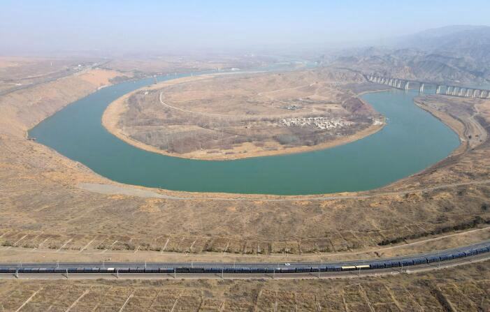 黃河流經(jīng)寧夏中衛(wèi)市沙坡頭區(qū)(3月3日攝,無人機照片)。 新華社記者 唐如峰 攝