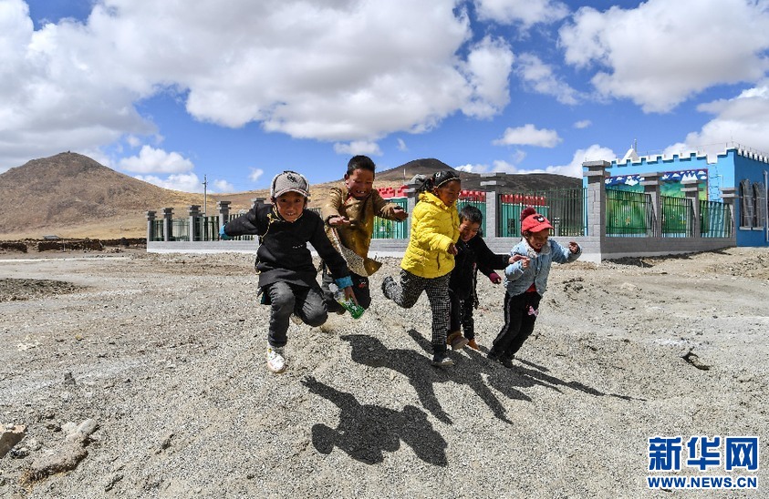 在我國(guó)海拔最高的行政鄉(xiāng)——西藏山南市浪卡子縣普瑪江塘鄉(xiāng),小朋友們?cè)谛陆ǔ傻挠變簣@前玩耍(2020年4月16日攝)。新華社記者 晉美多吉 攝