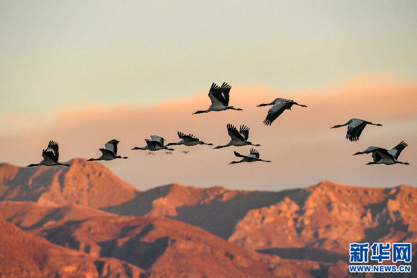黑頸鶴在拉薩市林周縣黑頸鶴自然保護(hù)區(qū)上空飛翔(2019年1月1日攝)。新華社記者 張汝鋒 攝