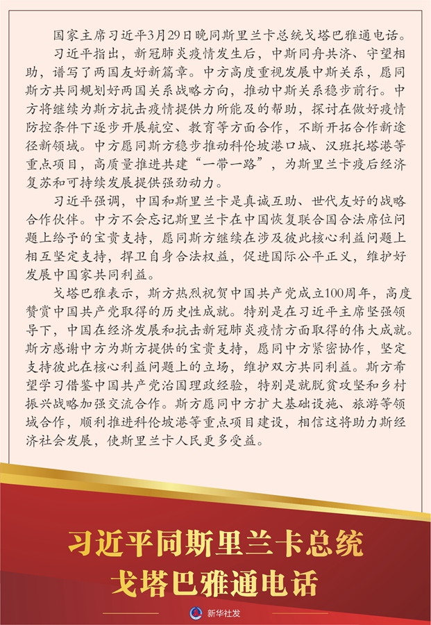 新華社北京3月29日電 國家主席習近平3月29日晚同斯里蘭卡總統戈塔巴雅通電話。