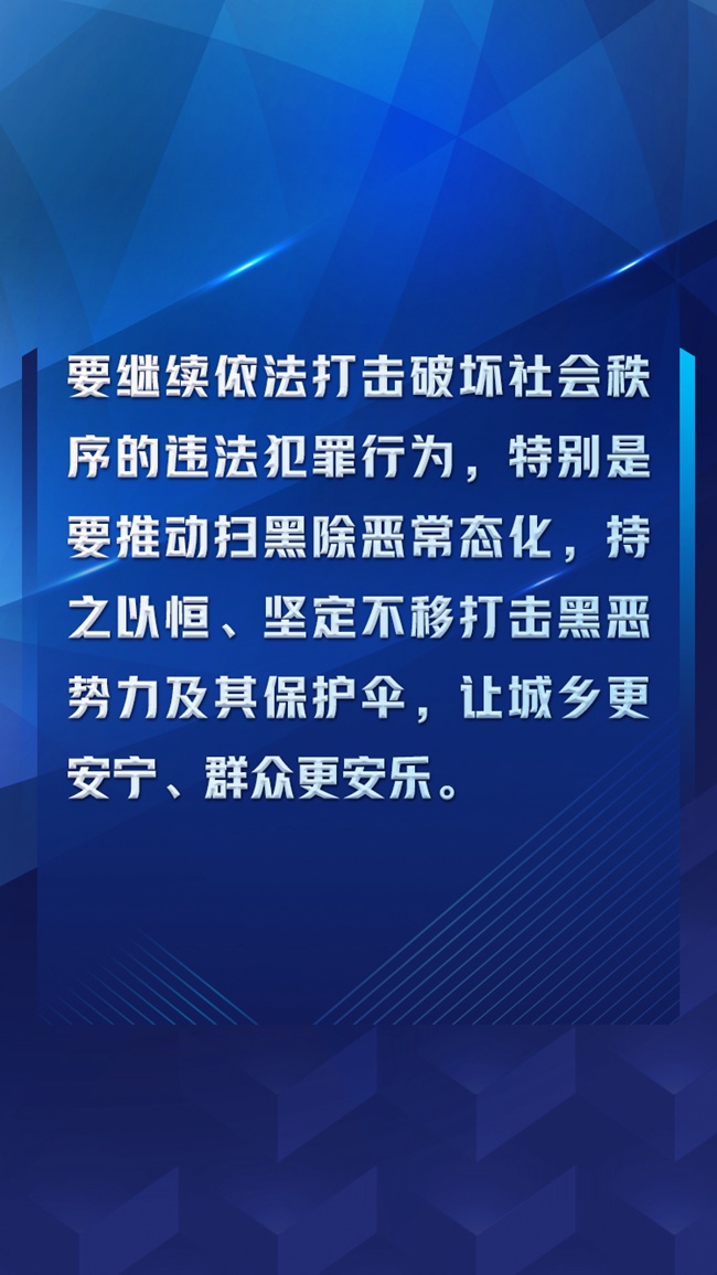 成就令人鼓舞,征途未有窮期。“十四五”規(guī)劃和2035年遠(yuǎn)景目標(biāo)綱要提出“推動(dòng)掃黑除惡常態(tài)化”,這為根治黑惡頑疾提供了更加堅(jiān)實(shí)的保障。要運(yùn)用好寶貴經(jīng)驗(yàn),推進(jìn)長(zhǎng)效機(jī)制建設(shè),打早打小、消除后患,常抓不懈、久久為功,堅(jiān)決不讓任何黑惡勢(shì)力死灰復(fù)燃,徹底鏟除黑惡勢(shì)力滋生土壤。要發(fā)揮社會(huì)治安綜合治理優(yōu)勢(shì),在深入實(shí)際、掌握實(shí)情上下功夫,在把握規(guī)律、精準(zhǔn)督導(dǎo)上下功夫,在依靠群眾、發(fā)動(dòng)群眾上下功夫,推動(dòng)各部門(mén)各司其職、齊抓共管,提高依法治理、系統(tǒng)治理、源頭治理水平,努力建設(shè)更高水平的平安中國(guó)。