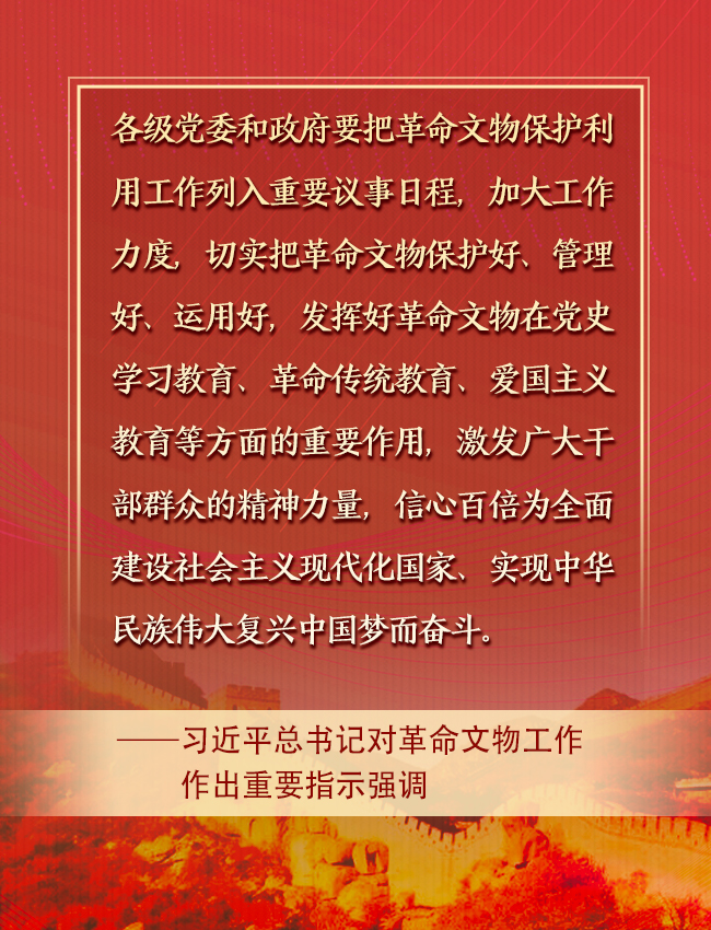 近日,習(xí)近平總書記對(duì)革命文物工作作出重要指示,深刻闡明革命文物工作的重大意義、目標(biāo)任務(wù)和基本要求,為做好新時(shí)代革命文物工作提供了根本遵循。