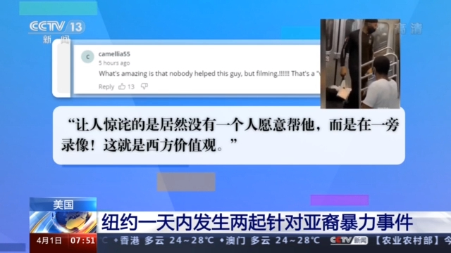 同一天,紐約市發生了另一起亞裔男子受襲事件。視頻顯示,嫌疑人在地鐵的車廂內不斷地揮舞拳頭毆打被害人的頭部,被害人昏迷后嫌疑人逃離現場。