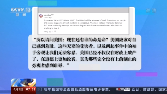 “所以請問美國:現在還有誰的命是命?美國應該對自己感到羞恥。這些無辜的受害者,以及兩起事件中的袖手旁觀讓我們無法容忍。美國已經不僅僅在財政上破產了,在道德上更加淪喪。真為那些完全沒有上前制止的旁觀者感到恥辱。”