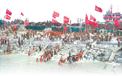 1998年8月15日,抗洪官兵在加固長江大堤九江城防堤。