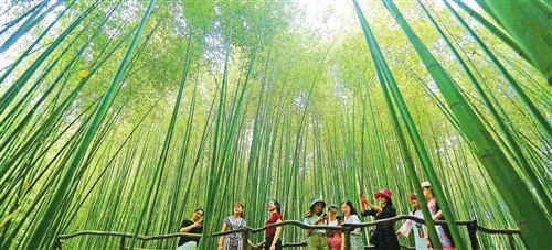 游客在山東省沂南縣銅井鎮竹泉村竹林棧道暢游,盡享春日美景。 王彥冰攝