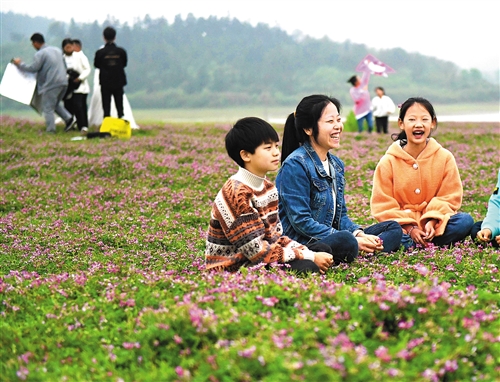 江西省樟樹市店下鎮夢湖畔紫云英花盛開,游客在此賞景,盡享無限春光。 肖 龑攝