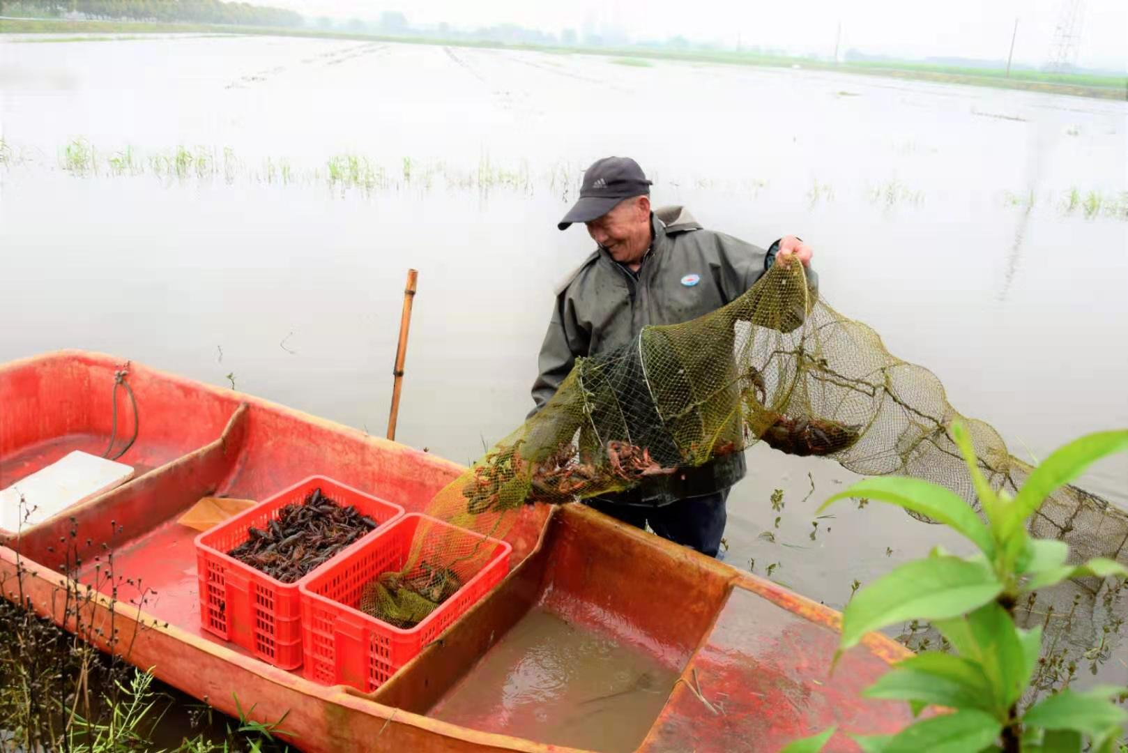 圖為:正在捕撈小龍蝦的蝦農