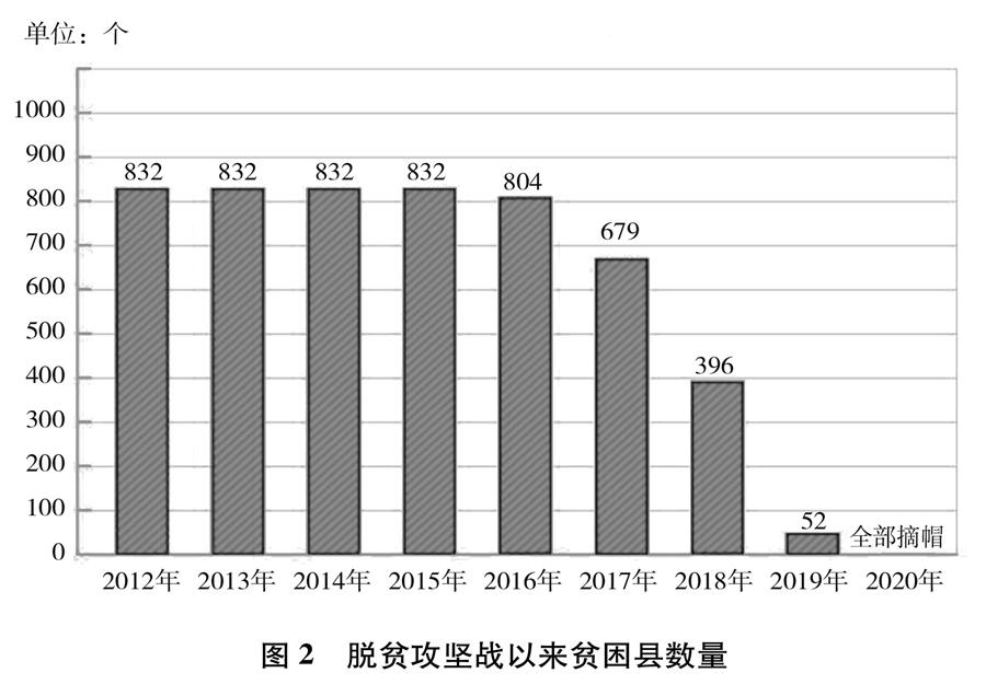 中共十八大以來,經過8年持續奮斗,到2020年底,中國如期完成新時代脫貧攻堅目標任務,現行標準下9899萬農村貧困人口全部脫貧(圖1),832個貧困縣全部摘帽(圖2),12.8萬個貧困村全部出列,區域性整體貧困得到解決,完成消除絕對貧困的艱巨任務。