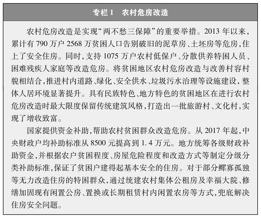“兩不愁三保障”全面實現。脫貧攻堅普查⑧顯示,貧困戶全面實現不愁吃、不愁穿,平時吃得飽且能適當吃好,一年四季都有應季的換洗衣物和御寒被褥。貧困人口受教育的機會顯著增多、水平持續提高,農村貧困家庭子女義務教育階段輟學問題實現動態清零,2020年貧困縣九年義務教育鞏固率達到94.8%。持續完善縣鄉村三級醫療衛生服務體系,把貧困人口全部納入基本醫療保險、大病保險、醫療救助三重制度保障范圍,實施大病集中救治、慢病簽約管理、重病兜底保障等措施,99.9%以上的貧困人口參加基本醫療保險,全面實現貧困人口看病有地方、有醫生、有醫療保險制度保障,看病難、看病貴問題有效解決。實施農村危房改造,貧困人口全面實現住房安全有保障(專欄1)。實施農村飲水安全和鞏固提升工程,累計解決2889萬貧困人口的飲水安全問題,飲用水量和水質全部達標,3.82億農村人口受益;貧困地區自來水普及率從2015年的70%提高到2020年的83%。