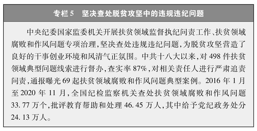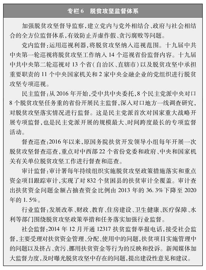 脫貧攻堅涉及面廣、要素繁多、極其復雜,需要強有力的組織領導和貫徹執行。充分發揮黨的政治優勢、組織優勢,建立中央統籌、省負總責、市縣抓落實的脫貧攻堅管理體制和片為重點、工作到村、扶貧到戶的工作機制,構建起橫向到邊、縱向到底的工作體系。各級黨委充分發揮總攬全局、協調各方的作用,執行脫貧攻堅一把手負責制,中西部22個省份黨政主要負責同志向中央簽署責任書、立下軍令狀,省市縣鄉村五級書記一起抓。脫貧攻堅期內,貧困縣黨委政府正職保持穩定。有脫貧任務的地區,倒排工期、落實責任,抓緊施工、強力推進。脫貧攻堅任務重的地區,把脫貧攻堅作為頭等大事和第一民生工程,以脫貧攻堅統攬經濟社會發展全局。實行最嚴格的考核評估和監督檢查,組織脫貧攻堅專項巡視,開展扶貧領域腐敗和作風問題專項治理(專欄5),加強脫貧攻堅督導和監察(專欄6),確保扶貧工作務實、脫貧過程扎實、脫貧結果真實,使脫貧攻堅成果經得起實踐和歷史檢驗。建立健全干部擔當作為的激勵和保護機制,加大關心關愛干部力度,樹立正確用人導向,引導廣大干部在決勝脫貧攻堅中奮發有為、履職盡責。加強基層扶貧隊伍建設,普遍建立干部駐村幫扶工作隊制度,按照因村派人、精準選派的原則,選派政治素質好、工作能力強、作風實的干部駐村扶貧。廣大駐村干部牢記使命、不負重托,心系貧困群眾,扎根基層扶貧一線,傾心傾力幫助貧困群眾找出路、謀發展、早脫貧。從2013年開始向貧困村選派第一書記和駐村工作隊,到2015年,實現每個貧困村都有駐村工作隊、每個貧困戶都有幫扶責任人。截至2020年底,全國累計選派25.5萬個駐村工作隊、300多萬名第一書記和駐村干部,同近200萬名鄉鎮干部和數百萬村干部一道奮戰在扶貧一線。