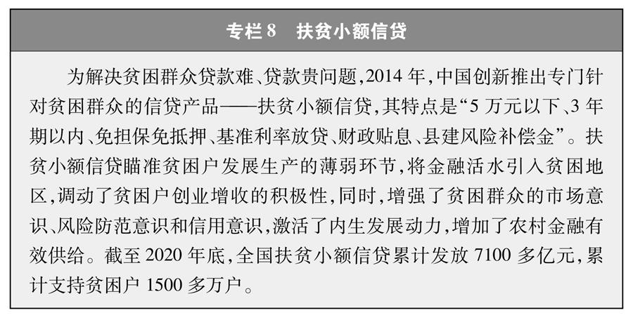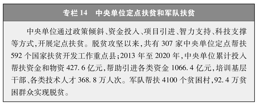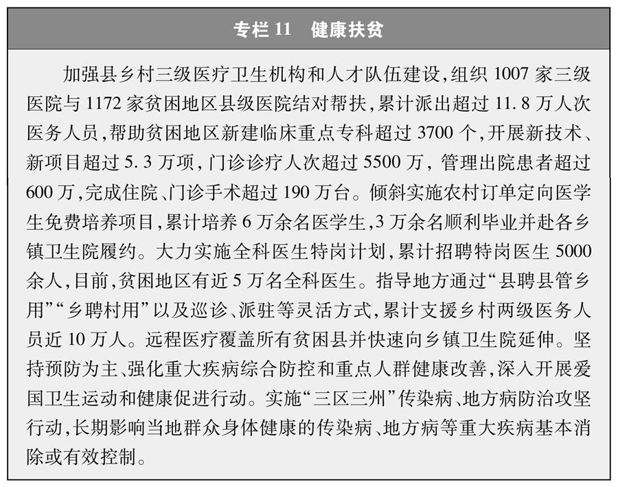中國還結合實際、因地制宜,采取其他多渠道多元化扶貧措施。大力推進就業扶貧,通過免費開展職業技能培訓、東西部扶貧協作勞務輸出、扶貧車間和扶貧龍頭企業吸納、返鄉創業帶動、扶貧公益性崗位安置等形式,支持有勞動能力的貧困人口在本地或外出務工、創業,貧困勞動力務工規模從2015年的1227萬人增加到2020年的3243萬人。開展健康扶貧工程,把健康扶貧作為脫貧攻堅重要舉措,防止因病致貧返貧(專欄11)。深入實施網絡扶貧工程,支持貧困地區特別是“三區三州”等深度貧困地區,完善網絡覆蓋,推進“互聯網+”扶貧模式。實施資產收益扶貧,把中央財政專項扶貧資金和其他涉農資金投入設施農業、光伏、鄉村旅游等項目形成的資產,折股量化到貧困村,推動產業發展,增加群眾收入,破解村集體經濟收入難題。2020年新冠肺炎疫情發生后,中國采取一系列應對疫情的幫扶舉措,加大就業穩崗力度,開展消費扶貧行動,有效克服了新冠肺炎疫情影響。