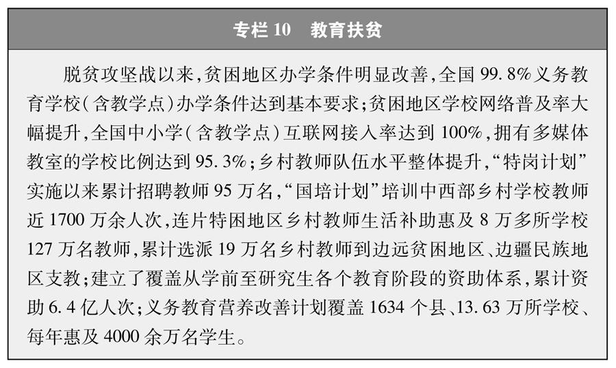 發展教育脫貧一批。堅持再窮不能窮教育、再窮不能窮孩子,加強教育扶貧,不讓孩子輸在起跑線上,努力讓每個孩子都有人生出彩的機會,阻斷貧困代際傳遞(專欄10)。持續提升貧困地區學校、學位、師資、資助等保障能力,20多萬名義務教育階段的貧困家庭輟學學生全部返校就讀,全面實現適齡少年兒童義務教育有保障。實施定向招生、學生就業、職教脫貧等傾斜政策,幫助800多萬貧困家庭初高中畢業生接受職業教育培訓、514萬名貧困家庭學生接受高等教育,重點高校定向招收農村和貧困地區學生70多萬人,拓寬貧困學生縱向流動渠道。開展民族地區農村教師和青壯年農牧民國家通用語言文字培訓,累計培訓350萬余人次,提升民族地區貧困人口就業能力。“學前學會普通話”行動先后在四川省涼山彝族自治州和樂山市馬邊彝族自治縣、峨邊彝族自治縣、金口河區開展試點,覆蓋43萬學齡前兒童,幫助他們學會普通話。