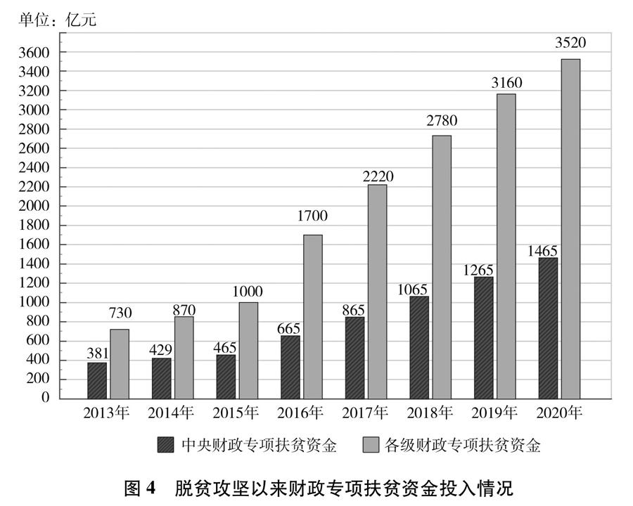 貧困地區發展條件差,貧困人口自我發展能力弱,消除貧困僅僅依靠個體、區域、民間等力量遠遠不夠,必須作為執政黨和國家的責任,上升為國家意志、國家戰略、國家行動。中國共產黨始終把消除貧困作為定國安邦的重要任務,制定實施一個時期黨的路線方針政策、提出國家中長期發展規劃建議,都把減貧作為重要內容,從國家層面部署,運用國家力量推進。幾代中國共產黨人,錨定一個目標,一茬接著一茬干。中共十八大以來,中國共產黨把脫貧攻堅擺在治國理政的突出位置,加強黨的集中統一領導,統籌謀劃、強力推進。從黨的領袖到廣大黨員干部,情系貧困群眾、心懷減貧大業,全黨目標一致、上下同心。加強頂層設計和戰略規劃,制定印發《關于打贏脫貧攻堅戰的決定》《關于打贏脫貧攻堅戰三年行動的指導意見》等政策文件,明確目標、路徑和具體措施并一以貫之抓下去。各級財政不斷加大投入力度(圖4),構建多元資金投入體系(專欄12),為減貧事業發展提供資金保障。發揮社會主義制度集中力量辦大事的優勢,廣泛動員各方力量積極參與。建立脫貧攻堅責任體系、政策體系、組織體系、投入體系、動員體系、監督體系、考核評估體系等制度體系,為脫貧攻堅順利推進提供了有力支撐。