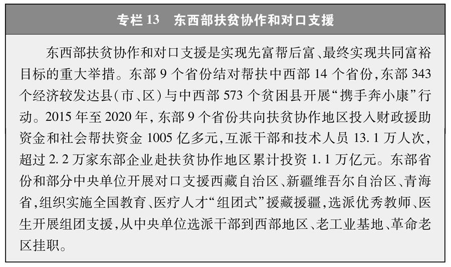 扶貧減貧是艱巨復雜的系統工程,需要調動各方積極參與。為打贏脫貧攻堅戰,中國共產黨依托嚴密組織體系和高效運行機制,廣泛有效動員和凝聚各方力量,構建政府、社會、市場協同推進,專項扶貧、行業扶貧、社會扶貧互為補充的大扶貧格局,形成跨地區、跨部門、跨單位、全社會共同參與的多元主體的社會扶貧體系。加強東西部扶貧協作和對口支援(專欄13),推動省市縣各層面幫扶,促進人才、資金、技術向貧困地區流動,實現優勢互補,縮小區域差距。積極開展定點扶貧,組織各級黨政機關、人民團體、國有企事業單位和軍隊幫扶貧困縣或貧困村(專欄14)。各民主黨派、工商聯和無黨派人士充分發揮各自優勢,為打贏脫貧攻堅戰獻智獻力。積極推動各行各業發揮專業優勢,開展產業扶貧、科技扶貧、教育扶貧、文化扶貧、健康扶貧、消費扶貧。廣泛動員民營企業參與扶貧開發,引導市場開發能力強的主體進入資源開發潛力大的地區,實現互惠互利、共同發展(專欄15)。廣泛動員社會組織、公民個人積極參與脫貧攻堅,開展扶貧公益活動。設立國家扶貧日,建立脫貧攻堅國家榮譽制度,表彰脫貧攻堅先進典型,營造了人人愿為、人人可為、人人能為的社會幫扶氛圍。