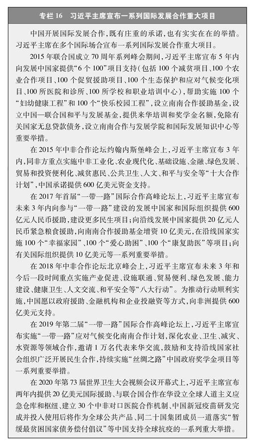 支持廣大發展中國家減貧發展。新中國成立伊始,在國家百廢待興、財力緊張的情況下,即向有關國家提供援助,為發展中國家爭取民族獨立和解放、促進經濟社會發展提供了支持。改革開放后,中國對外援助內容更加豐富、形式更加多樣,促進了中國與其他發展中國家的共同發展。進入新時代,中國擔負大國責任,推動對外援助向國際發展合作轉型升級,為破解全球發展難題、落實聯合國2030年可持續發展議程提出中國方案、貢獻中國智慧、注入中國力量。習近平主席在多個國際重大場合宣布中國開展國際發展合作的一系列務實舉措,已按期落實或正在按照進度有序推進(專欄16)。中國發起共建“一帶一路”倡議,推動更大范圍、更高水平、更深層次的區域經濟社會發展合作,支持幫助相關國家更好實現減貧發展。據世界銀行研究報告,共建“一帶一路”將使相關國家760萬人擺脫極端貧困、3200萬人擺脫中度貧困。新中國成立70多年來,中國向亞洲、非洲、拉丁美洲和加勒比地區、大洋洲和歐洲等地區160多個國家和國際組織提供多種形式的援助,減免有關國家債務,為廣大發展中國家落實千年發展目標提供幫助。