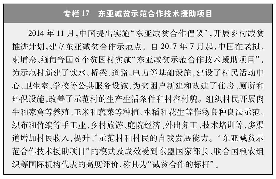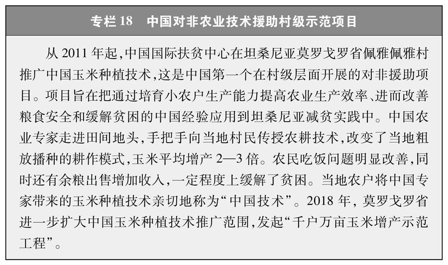 實施惠及民生的國際減貧合作項目。在亞洲地區,中國與東盟國家共同開展鄉村減貧推進計劃,在老撾、柬埔寨、緬甸三國鄉村基層社區實施“東亞減貧示范合作技術援助項目”(專欄17)。在非洲地區,中國為非洲國家援建水利基礎設施、職業技術學校、社會保障住房等設施,打造農業合作示范區,推進實施中非菌草技術合作、中非友好醫院建設、非洲疾控中心總部建設等項目(專欄18)。在南太平洋地區,中國推動落實對太平洋島國無償援助、優惠貸款等舉措,開展基礎設施建設和農業、醫療等技術合作援助項目。在拉美地區,援建農業技術示范中心,幫助受援國當地民眾擺脫貧困。中國還與聯合國教科文組織合作設立國際農村教育研究與培訓中心等機構,面向非洲、東南亞等國家實施農村教育轉型、教師培訓等項目。
