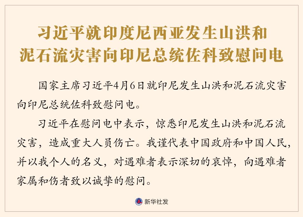 新華社北京4月6日電 國家主席習近平4月6日就印尼發生山洪和泥石流災害向印尼總統佐科致慰問電。