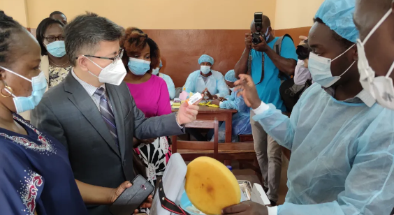 駐貝寧大使彭驚濤在貝寧衛(wèi)生部官員的陪同下前往普拉科吉(Placodji)衛(wèi)生中心,現(xiàn)場(chǎng)了解疫苗接種情況,與中國(guó)公民交流接種感受。隨后向貝寧衛(wèi)生部贈(zèng)送醫(yī)用防護(hù)口罩、隔離服等防疫物資。