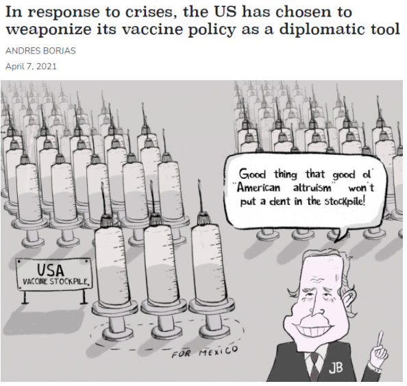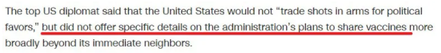 除了分享疫苗的時(shí)間和對(duì)象不明,布林肯的每句話幾乎都讓人聽出了打自己臉的意思。比如,布林肯稱美國(guó)“不會(huì)用疫苗換取政治利益”。可實(shí)際上,美國(guó)同意“借給”墨西哥疫苗的條件就是后者必須管好美墨邊境上的非法移民潮。