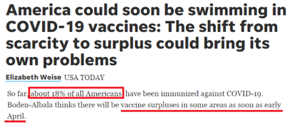 截至目前,美國(guó)已有超過6200萬人完全接種了疫苗,約占總?cè)丝诘?8%。有專家認(rèn)為,美國(guó)一些地區(qū)最早在4月初就會(huì)出現(xiàn)疫苗過剩的情況。