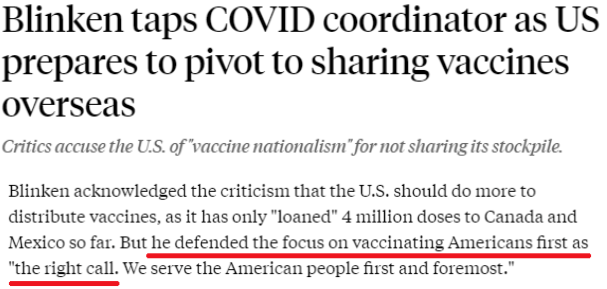 在公開表示要搞“疫苗外交”之前,美國(guó)給世人留下的最大印象恐怕就是“疫苗民族主義”了。