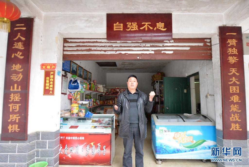 石光武站在他家的小賣部前(資料照片)。新華社發(唐續宗 攝)