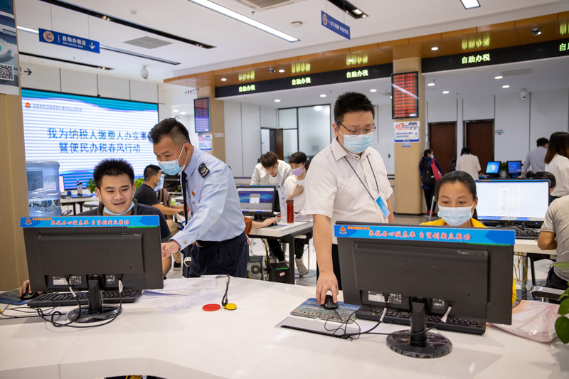 4月15日,珠海橫琴辦稅服務(wù)廳,工作人員協(xié)助市民申報(bào)業(yè)務(wù)。人民日?qǐng)?bào)記者 張武軍攝