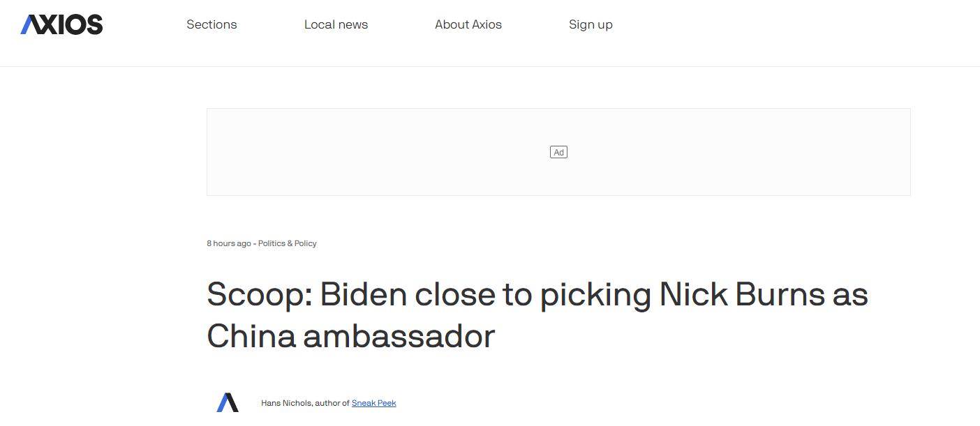 【環球網報道】 “拜登接近提名尼克·伯恩斯擔任美駐華大使”,美國Axios網站15日以此為題報道稱,知情人士透露,美國前副國務卿尼古拉斯·伯恩斯擔任美國駐華大使的審查工作已進入最后階段。