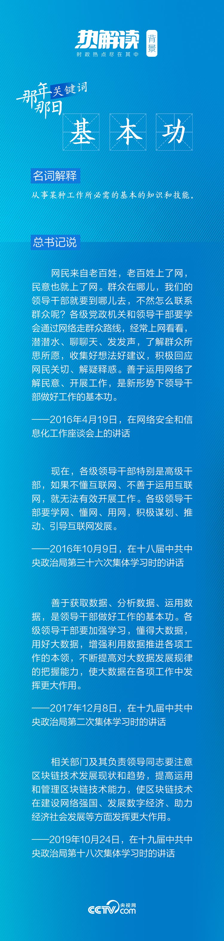 《熱解讀》關(guān)注到,這次重要講話中所提的“基本功”,之后總書記又多次提及,并反復(fù)強(qiáng)調(diào)互聯(lián)網(wǎng)時(shí)代領(lǐng)導(dǎo)干部“運(yùn)用網(wǎng)絡(luò)”的重要意義。