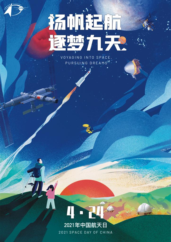 經(jīng)過評審,由來自蘭州大學(xué)藝術(shù)學(xué)院的王淑君同學(xué)設(shè)計(jì)的海報(bào)被選定為2021年“中國航天日”宣傳海報(bào),該作品緊扣“揚(yáng)帆起航 逐夢九天”的主題,色彩和諧,富有想象力。畫面中,在南京紫金山天文臺的襯托下,一位父親帶著女兒遙望星空,講述著嫦娥五號、天問一號和中國空間站的壯舉,勾勒出一幅溫馨而美好的畫面,寓意著不斷發(fā)展的事業(yè),不懈追求的航天夢。宣傳海報(bào)可從“中國的航天”微信公眾號、國家航天局網(wǎng)站下載。