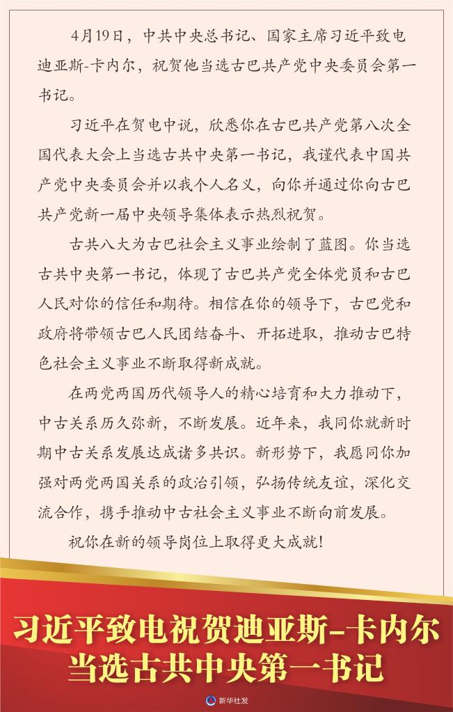 新華社北京4月20日電 4月19日,中共中央總書記、國家主席習近平致電迪亞斯-卡內爾,祝賀他當選古巴共產黨中央委員會第一書記。