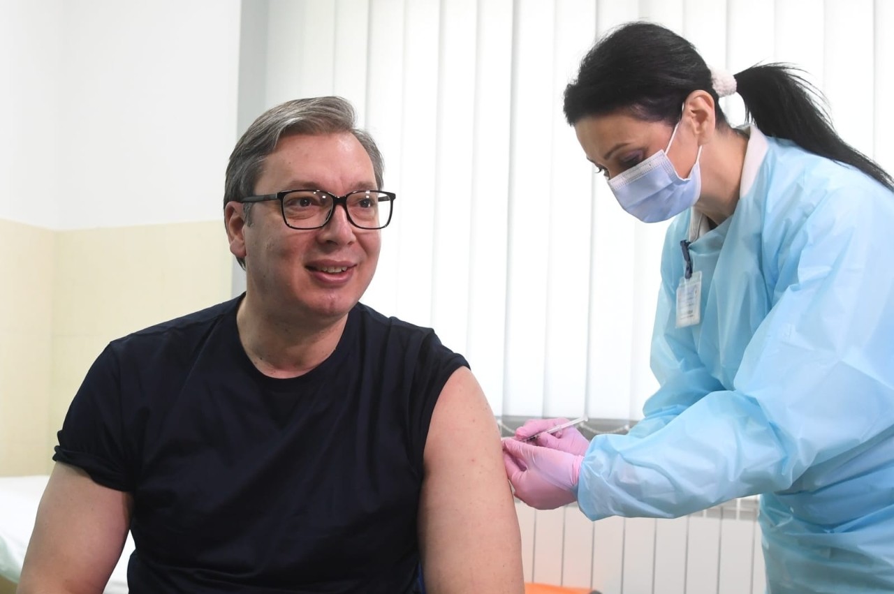△當(dāng)?shù)貢r(shí)間2021年4月6日,塞爾維亞總統(tǒng)武契奇在馬伊丹佩克市魯?shù)录{格拉瓦村衛(wèi)生防疫站接種第一劑中國(guó)國(guó)藥集團(tuán)新冠滅活疫苗。武契奇在接種后表示:“感覺很棒。”
