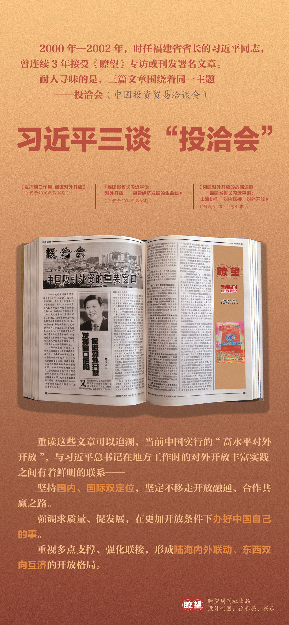 2002年10月14日,《瞭望》刊發專訪報道《構建對外開放的戰略通道——福建省省長習近平談:山海協作,對內聯接,對外開放》。文中,習近平由第六屆投洽會成果,談及福建進一步擴大對外開放的具體思路——著力構建山海協作、對內聯接、對外開放三條戰略通道!