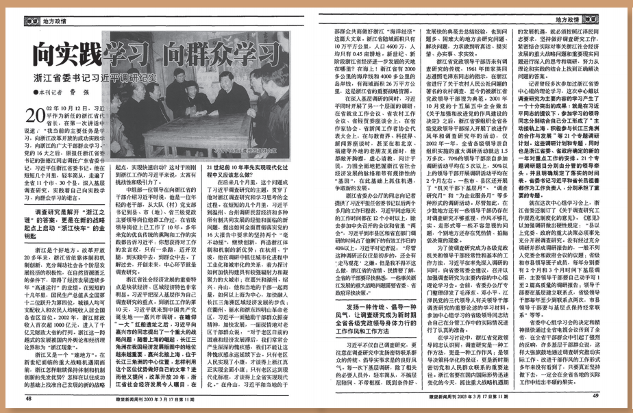 半年后的2003年3月全國兩會前夕,費強專訪了已任浙江省委書記的習近平,為當年第10期《瞭望》采寫了《浙江省委書記習近平:雙輪驅動提速發展》一稿!