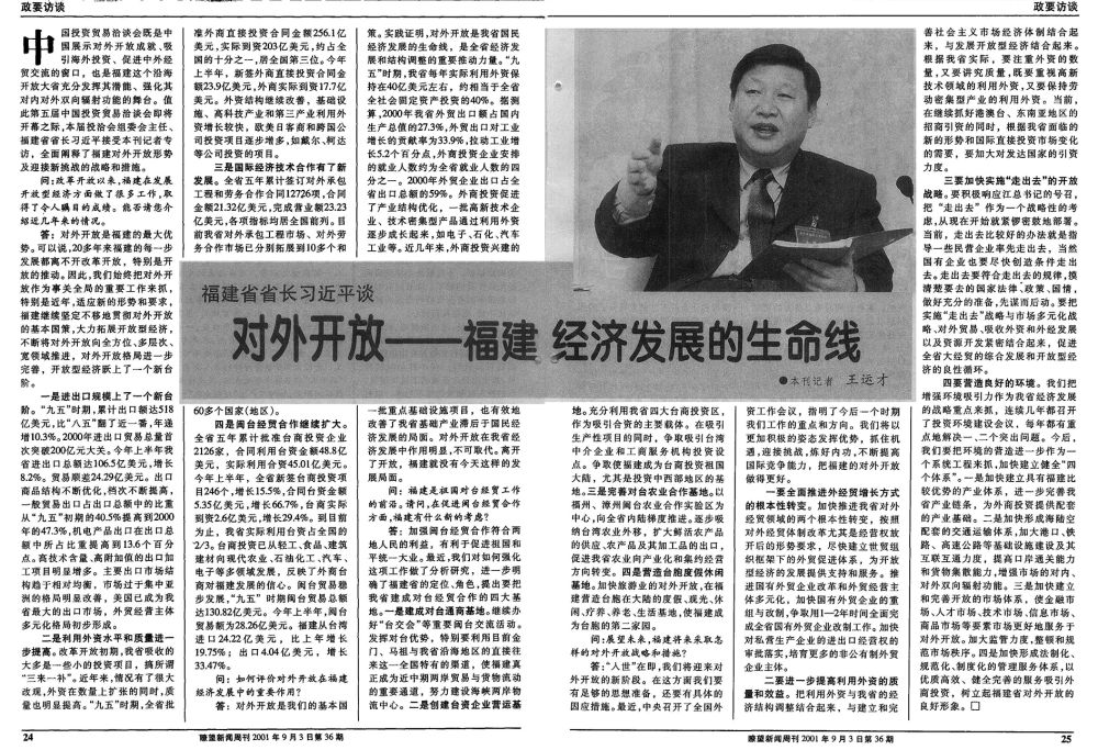 2001年9月3日,《瞭望》再次刊發專訪報道《福建省省長習近平談:對外開放——福建經濟發展的生命線》!