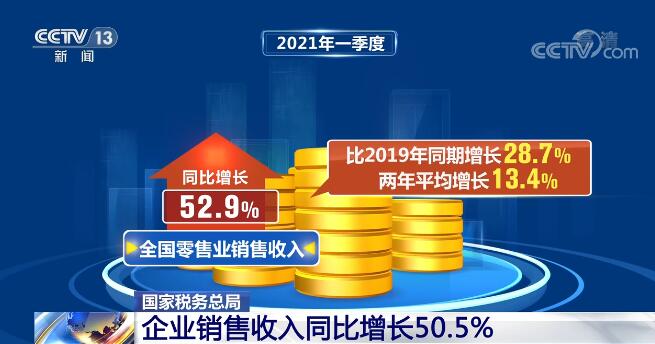 國家稅務總局增值稅發票數據顯示,2021年一季度,全國企業銷售收入同比增長50.5%,比2019年同期增長27.2%,兩年平均增長12.8%。