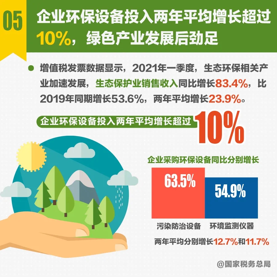 增值稅發(fā)票數(shù)據(jù)顯示,2021年一季度,生態(tài)環(huán)保相關(guān)產(chǎn)業(yè)加速發(fā)展,生態(tài)保護(hù)業(yè)銷售收入同比增長(zhǎng)83.4%,比2019年同期增長(zhǎng)53.6%,兩年平均增長(zhǎng)23.9%。環(huán)保設(shè)備投入力度加大,企業(yè)采購(gòu)污染防治設(shè)備、環(huán)境監(jiān)測(cè)儀器同比分別增長(zhǎng)63.5%和54.9%,兩年平均分別增長(zhǎng)12.7%和11.7%。