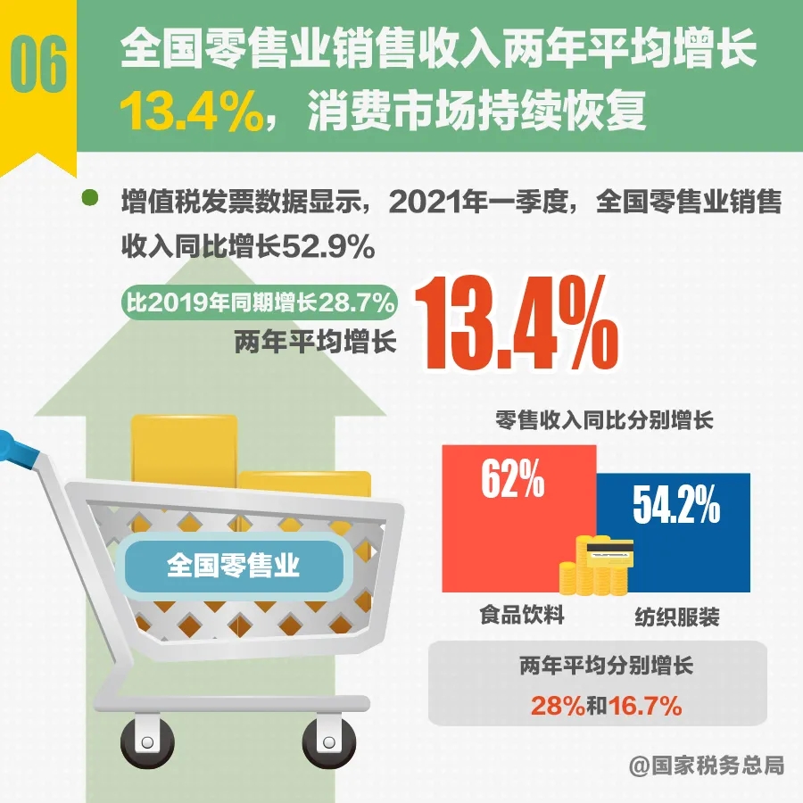 增值稅發(fā)票數(shù)據(jù)顯示,2021年一季度,全國(guó)企業(yè)銷售收入同比增長(zhǎng)50.5%,比2019年同期增長(zhǎng)27.2%,兩年平均增長(zhǎng)12.8%,延續(xù)了去年下半年以來(lái)平穩(wěn)向好的增長(zhǎng)態(tài)勢(shì)。