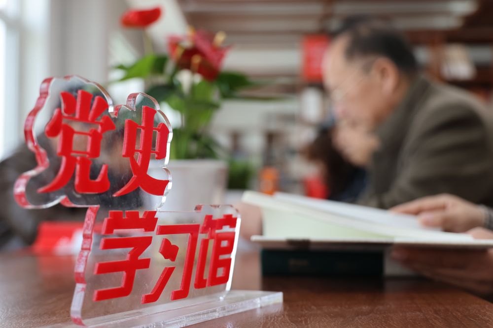 ↑2021年3月16日,人們在河北黃驊市驊中街道信譽樓社區黨史學習館學習黨史。